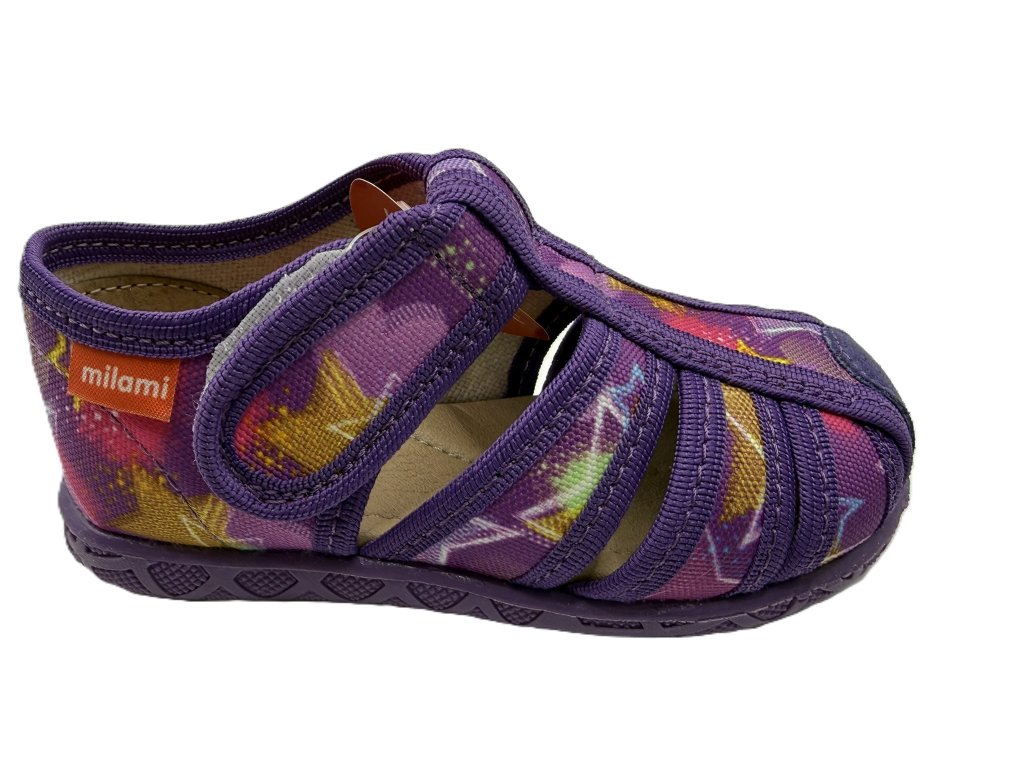 Dětské bačkory Milami lze nosit v létě také jako textilní sandálky na ven. Špička je opatřena praktickým okopem z broušené kůže, který brání prošoupání při hrách na koberci nebo venku. Bačkůrky mají zpevněný opatek a tvarovanou koženou stélku, která je pevně přišita k botě.