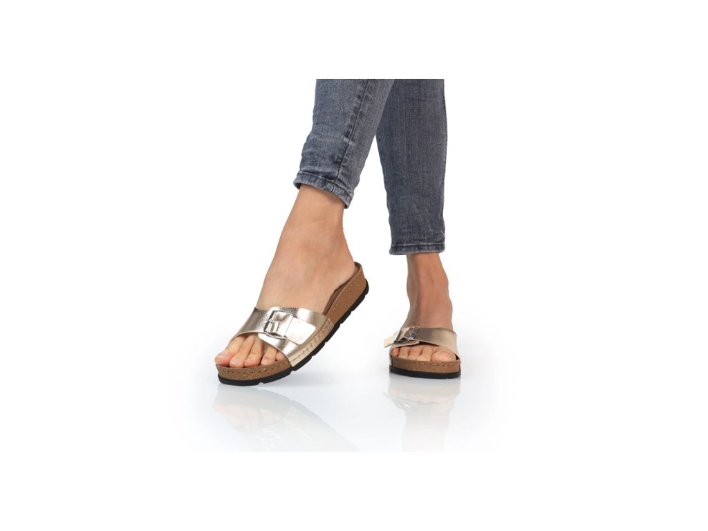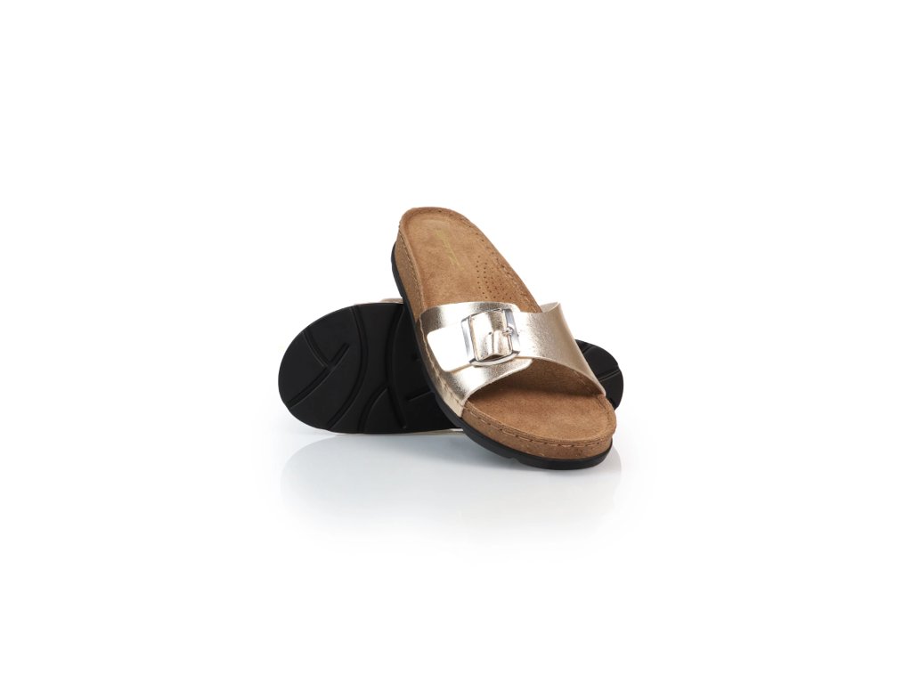 Dámské pantofle Batz Ibiza gold / ve zlaté barvě. Elegantní a módní obuv, lehká a výjimečně ženská. Elegantní pásek ve zlaté barvě dodává botám moderní vzhled, který podtrhuje lesklá zlatá přezka, kterou si můžete přizpůsobit podle svého vkusu, můžete ji nosit jako šperk a může být krásnou korunkou každého outfitu. Perfektní střevíčky k romantickým šatům s květinovým potiskem nebo k rozevlátým džínům, v kombinaci se zlatými šperky jsou prostě fantastické! Extrémně lehká, pružná konstrukce podrážky Batz, svršek z kvalitní kůže a anatomicky tvarovaná stélka zajišťují pohodlné nošení.