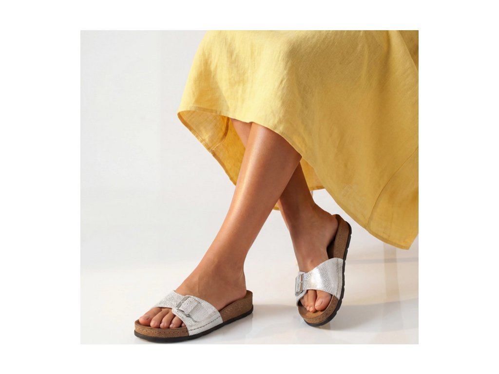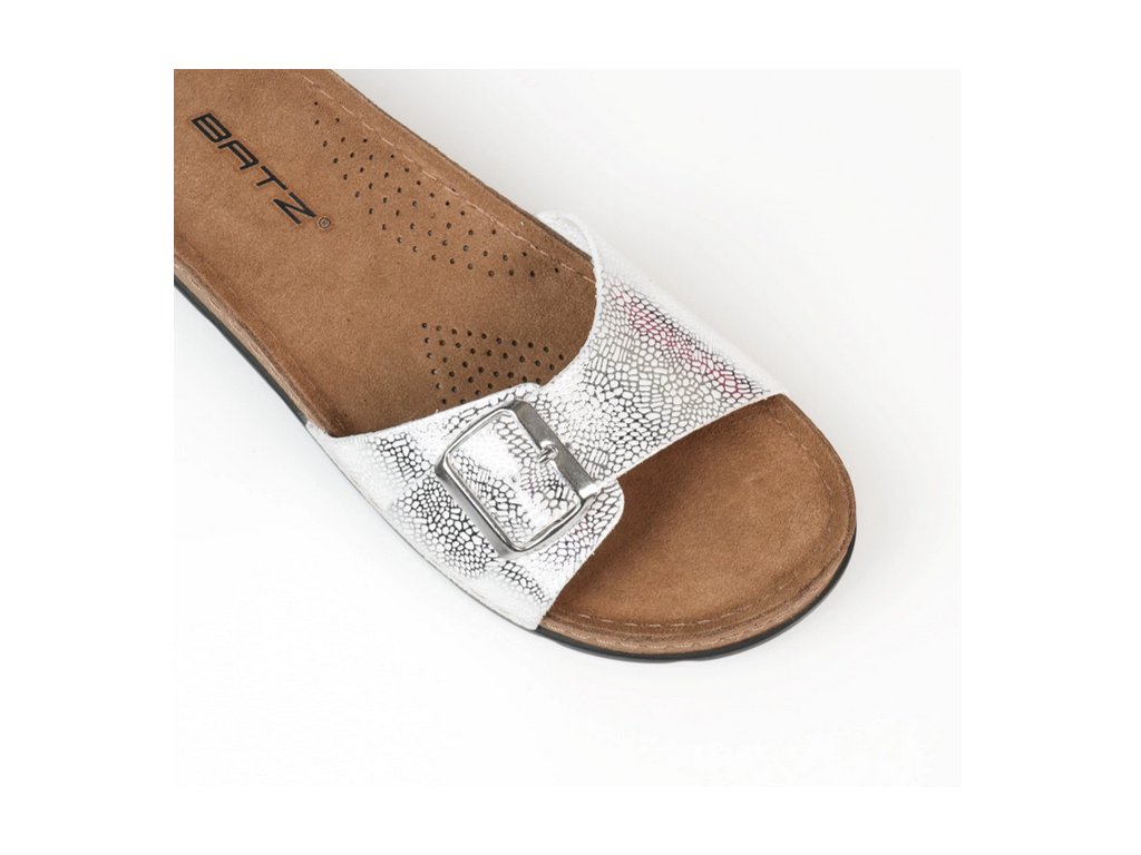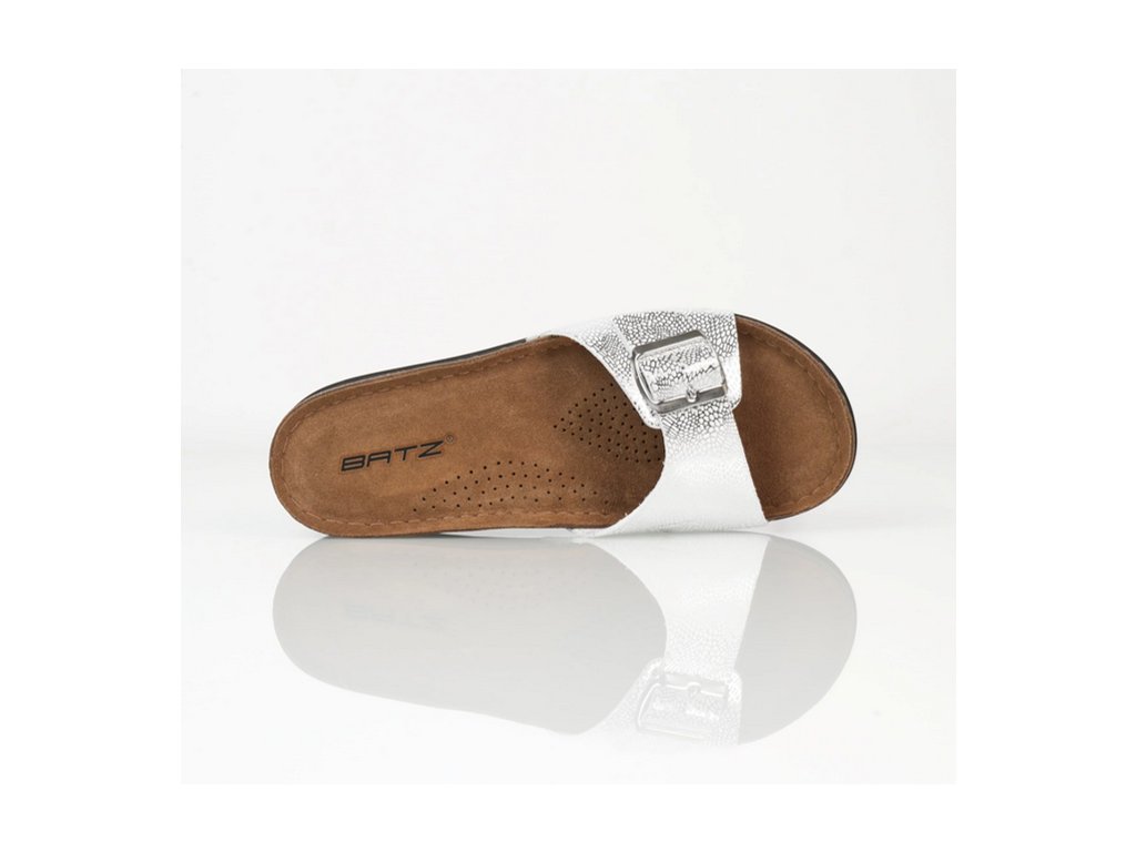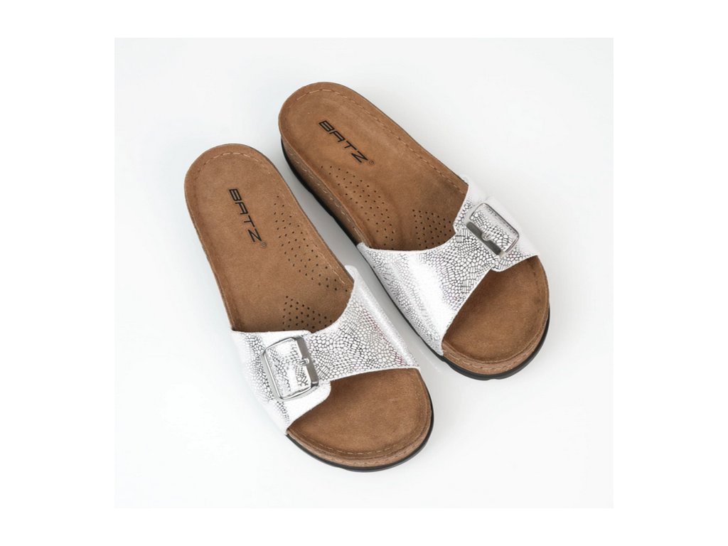 Dámské pantofle Batz Ibiza silver / ve stříbrné barvě. Elegantní a módní obuv, lehká a výjimečně ženská. Elegantní pásek ve zlaté barvě dodává botám moderní vzhled, který podtrhuje lesklá zlatá přezka, kterou si můžete přizpůsobit podle svého vkusu, můžete ji nosit jako šperk a může být krásnou korunkou každého outfitu. Perfektní střevíčky k romantickým šatům s květinovým potiskem nebo k rozevlátým džínům, v kombinaci se zlatými šperky jsou prostě fantastické! Extrémně lehká, pružná konstrukce podrážky Batz, svršek z kvalitní kůže a anatomicky tvarovaná stélka zajišťují pohodlné nošení.
