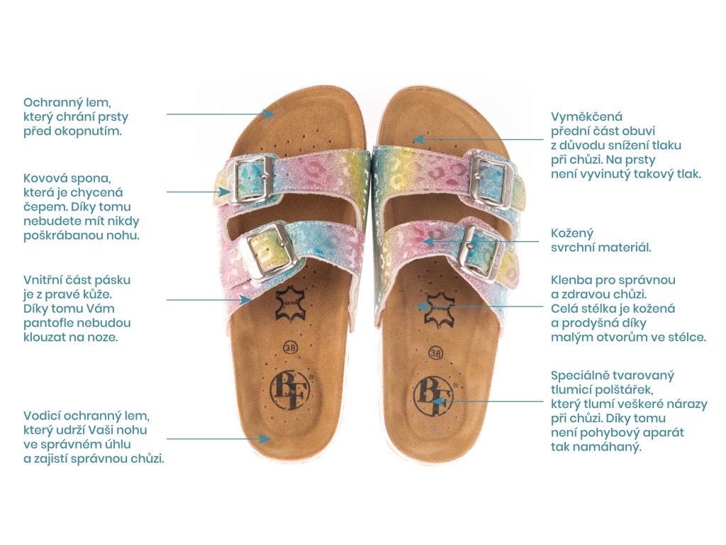 Pánské, dámské a dětské pantofle BF jsou vybavené speciální technologií Soft impact cushion – chytrými tlumícími polštářky pro měkčí nášlap a větší pohodlí. Důležité jsou i kvalitní materiály – všechny modely BF jsou vyrobeny pouze z pravé kůže. Obuv BF přináší pohodlí a zároveň poskytuje ochranu chodidla před nárazy. To všechno díky specifické konstrukci, kvalitním materiálům a nejmodernější technologii. Stélka je vzdušná a omezuje pocení chodidla. Délku pásků jednoduše upravíte pomocí kvalitních přezek.